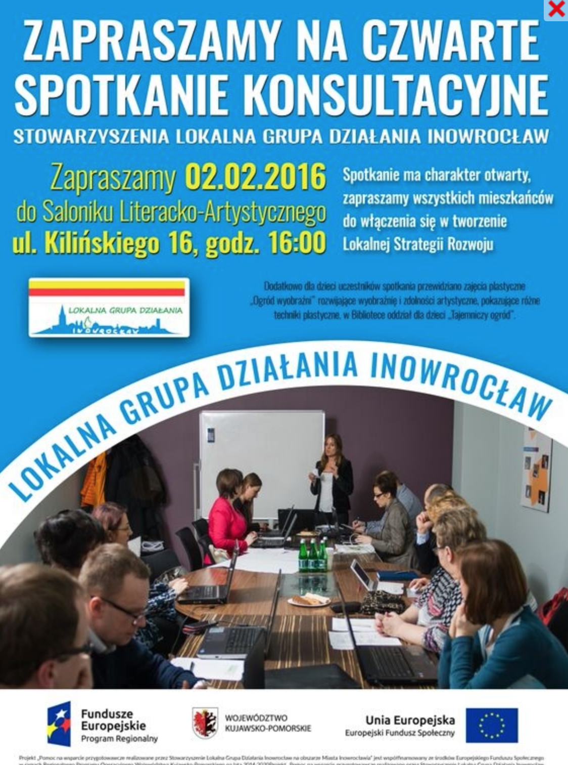 Swoje uwagi również należy kierować mailowo na adres lgd@inowroclaw.pl do dnia 1.02.2016 lub osobiście na czwartym spotkaniu konsultacyjnym 2.02.2016 r o godz. 16:00 w Saloniku Literacko-Artystycznym Biblioteki Miejskiej, ul. Kilińskiego 16.
