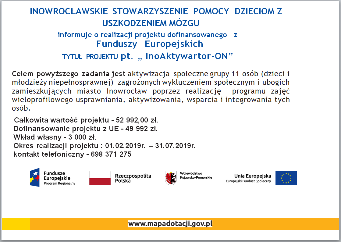 „InoAktywartor-ON” realizowany jest przez Inowrocławskie Stowarzyszenie Pomocy Dzieciom z Uszkodzeniem Mózgu w ramach osi priorytetowej 11 Rozwój Lokalny Kierowany przez Społeczność, działanie 11.1. Włączenie społeczne na obszarach objętych LSR RPO WKP na lata 2014-2020.
