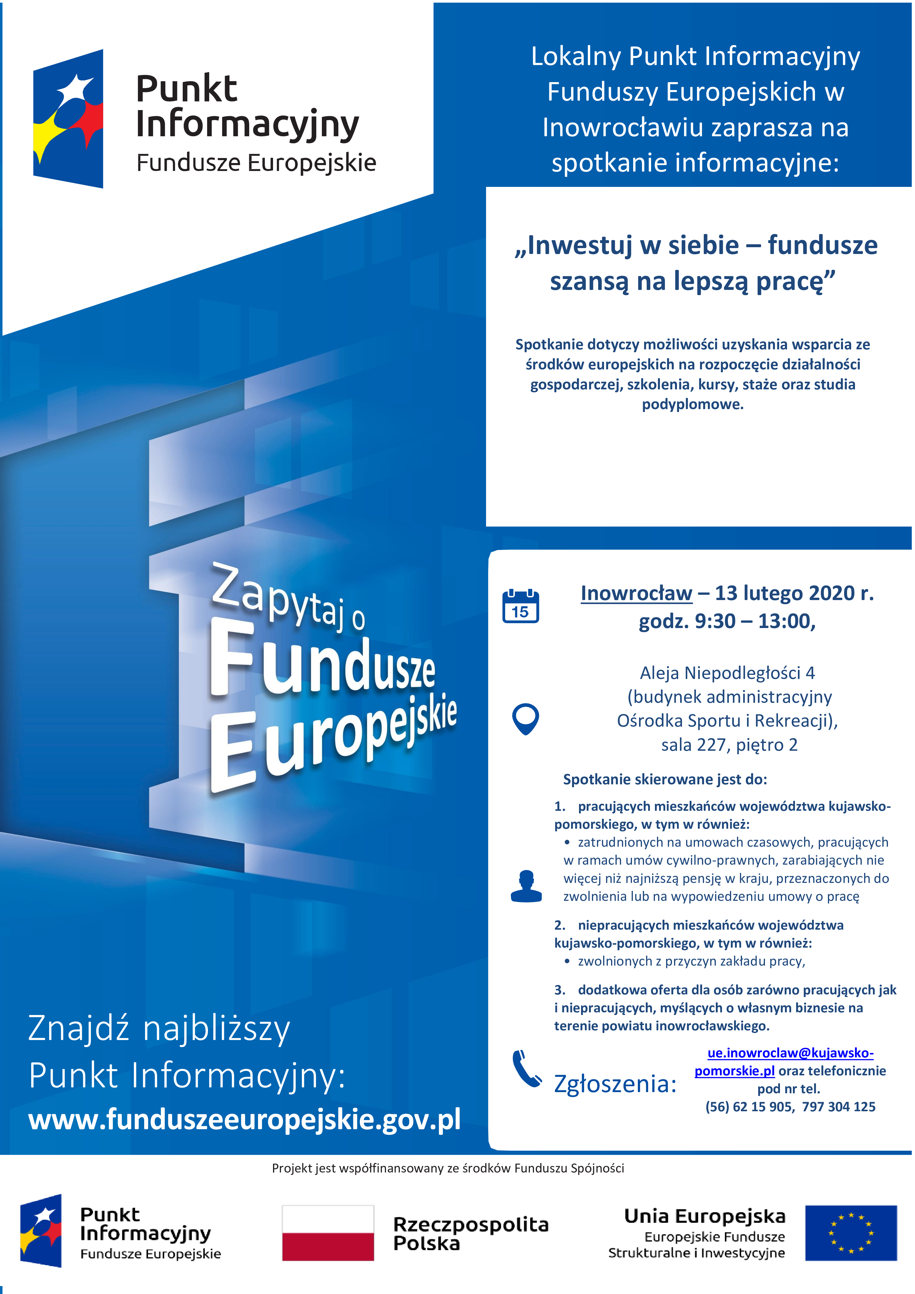Lokalny Punkt Informacyjny Funduszy Europejskich w Inowrocławiu serdecznie zaprasza na spotkania informacyjne pt.: „Inwestuj w siebie – fundusze szansą na lepszą pracę”, dotyczące możliwości uzyskania wsparcia ze środków europejskich na rozpoczęcie działalności gospodarczej, szkolenia, kursy, staże oraz studia podyplomowe.
