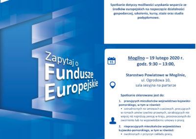 Inowrocław – 13 lutego 2020 r., Lokalny Punkt Informacyjny Funduszy Europejskich  w Inowrocławiu, ul. Aleja Niepodległości 4; II piętro sala nr 227, godz. 9:30-13:00.