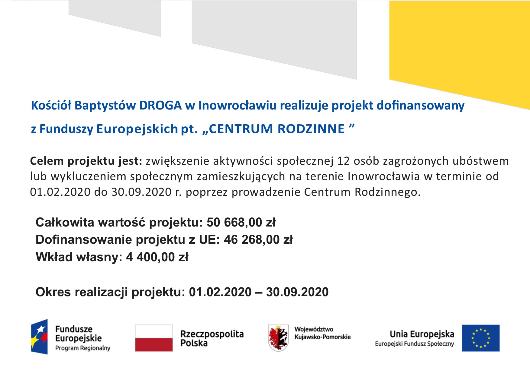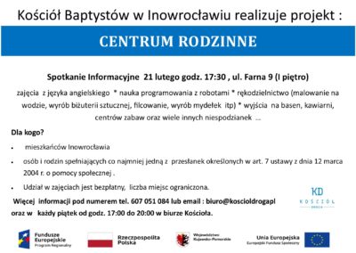 “Centrum Rodzinne” realizowane przez Zbór Kościoła Chrześcijan Baptystów w Inowrocławiu w ramach osi priorytetowej 11 Rozwój Lokalny Kierowany przez Społeczność, działanie 11.1. Włączenie społeczne na obszarach objętych LSR RPO WK-P na lata 2014-2020.