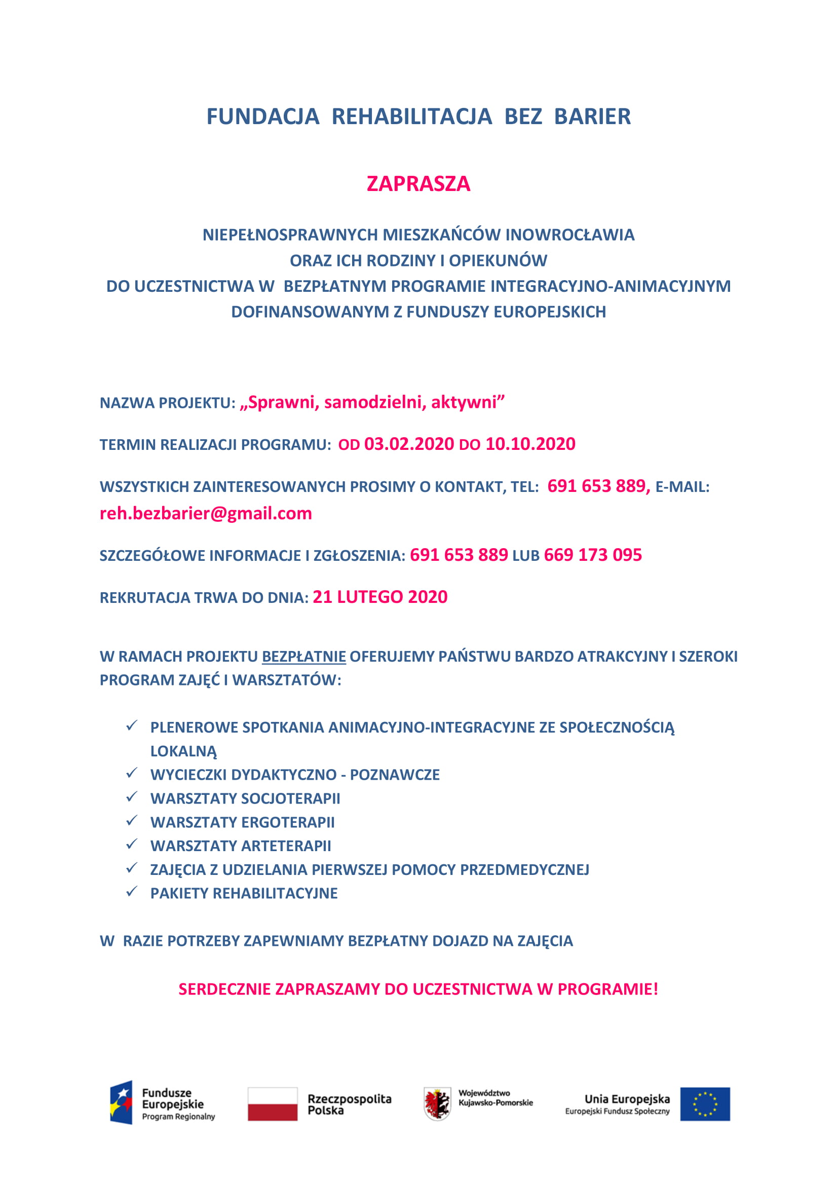 “Sprawni, samodzielni, aktywni” realizowane przez Fundacja Rehabilitacja bez barier w ramach osi priorytetowej 11 Rozwój Lokalny Kierowany przez Społeczność, działanie 11.1. Włączenie społeczne na obszarach objętych LSR RPO WK-P na lata 2014-2020.