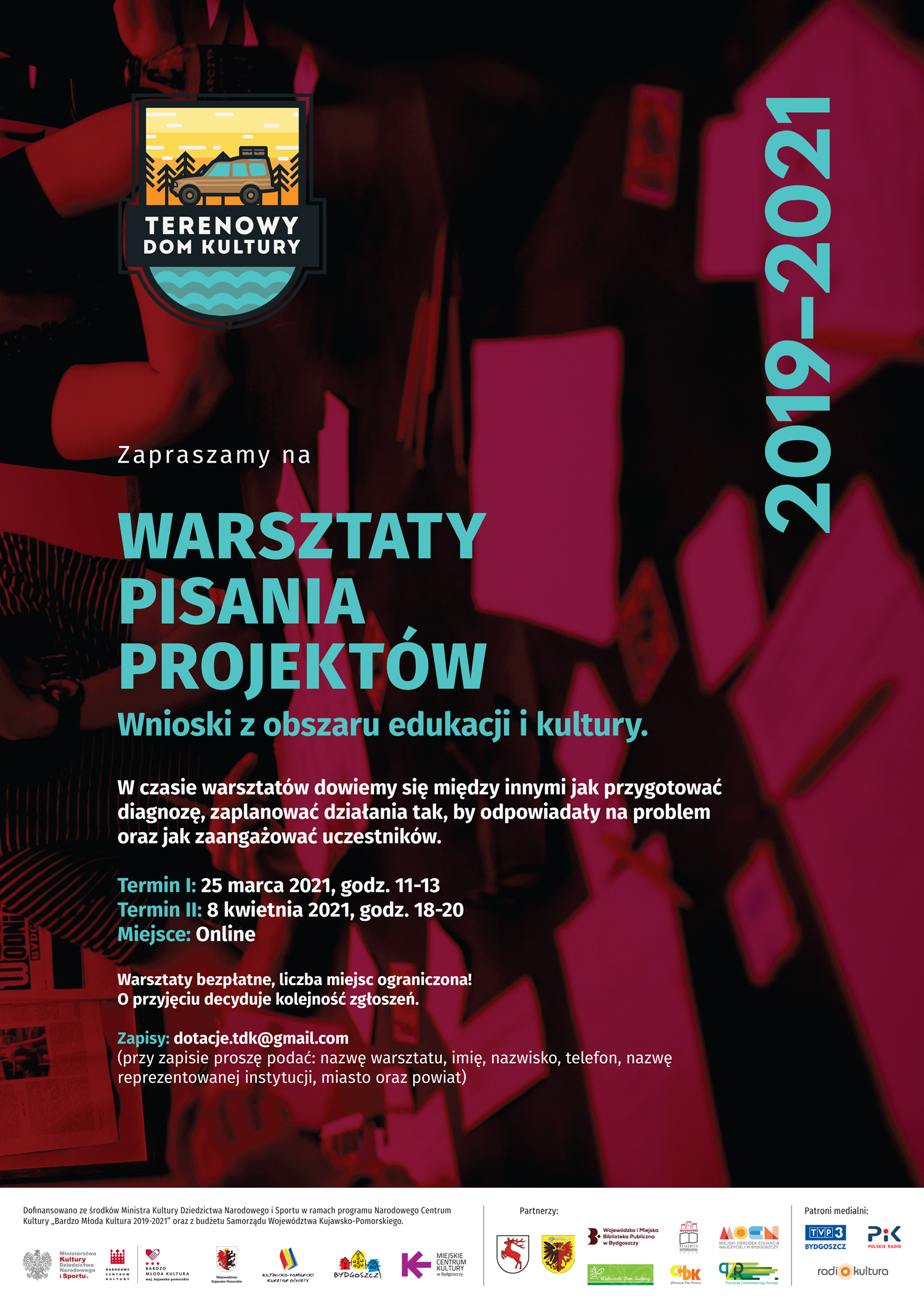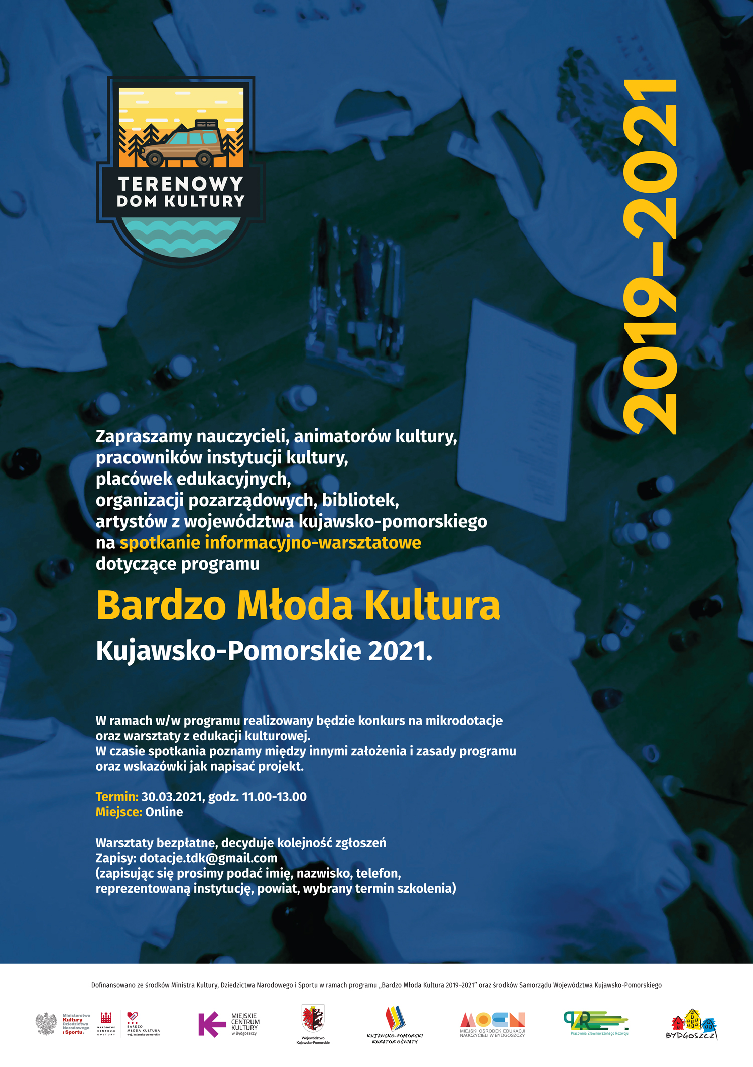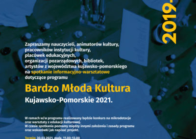 - Dla nauczycieli, animatorów kultury, pracowników instytucji kultury, placówek edukacyjnych, organizacji pozarządowych, bibliotek, artystów z Województwa Kujawsko-Pomorskiego odbędzie się spotkanie informacyjno-warsztatowe dotyczące programu Bardzo Młoda Kultura Kujawsko-Pomorskie 2021. W ramach w/w programu realizowany będzie konkurs na mikrodotacje oraz warsztaty z edukacji kulturowej. W czasie spotkania będzie możliwość poznania m.in. założenia i zasady programu oraz wskazówki jak napisać projekt.