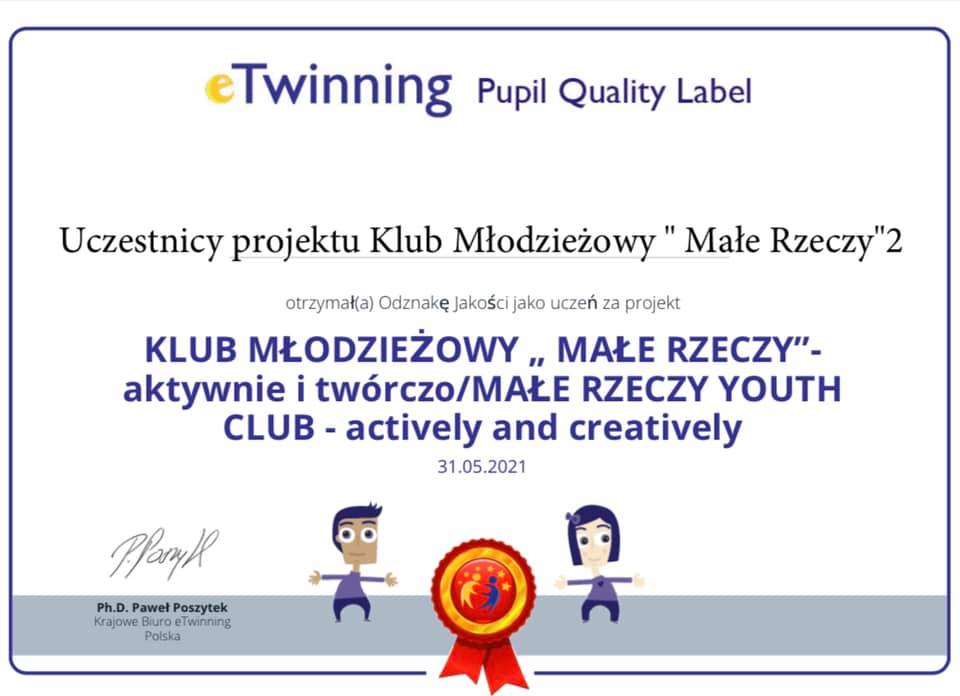 Aktywnie i twórczo, prowadzony otrzymał prestiżową nagrodę Krajowej Odznaki Jakości – Quality Lebel. Krajowe Biuro eTwinning w Warszawie doceniło innowacyjną metodę grupowego prowadzenia zajęć w zakresie rozwoju wielu zainteresowań. Projekt był międzynarodowy, a uczestnikami była także młodzież z Armenii