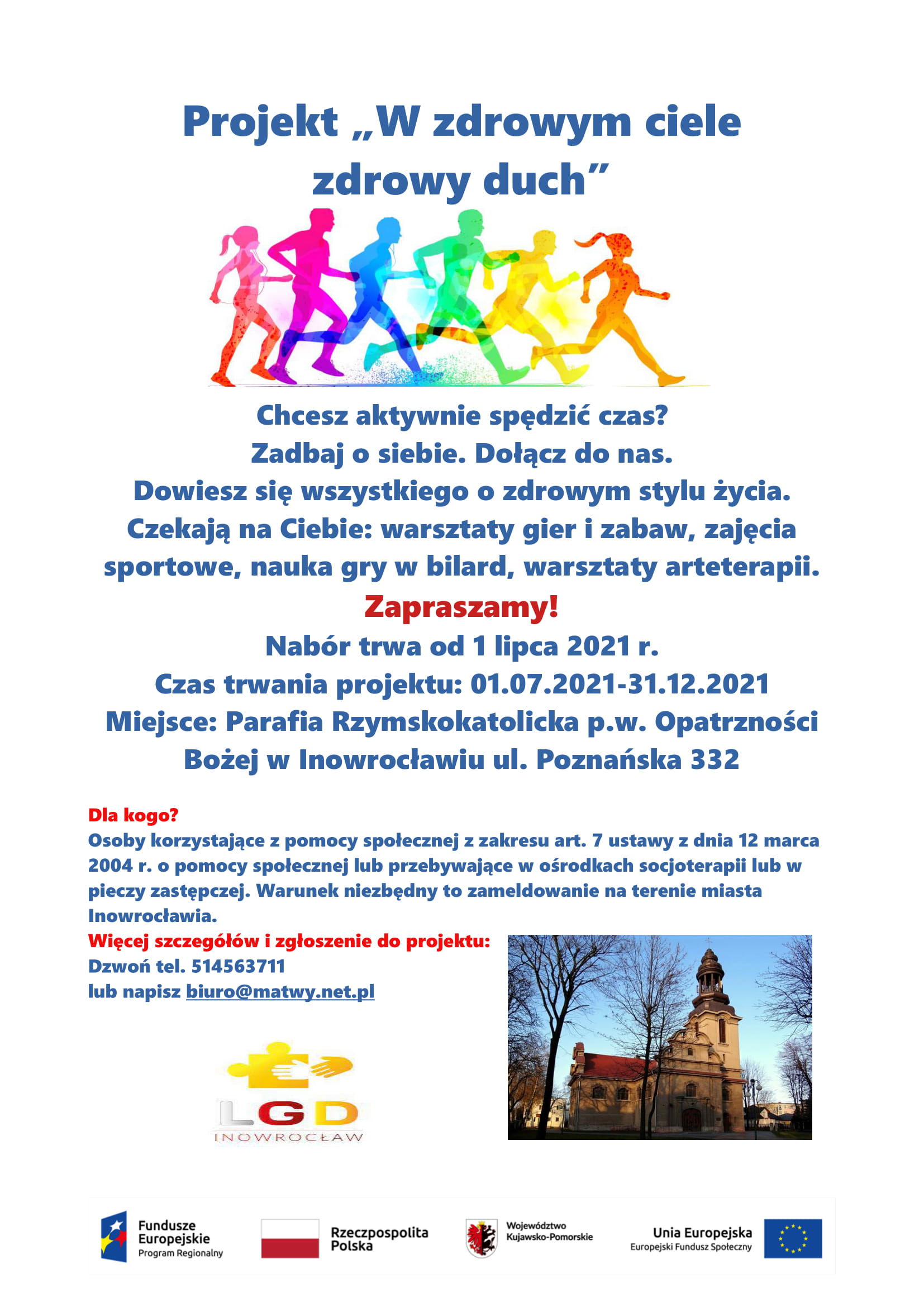 Celem projektu jest zmniejszenie skali wykluczenia społecznego i ubóstwa w Inowrocławiu oraz zaktywizowanie społeczne osób wykluczonych społecznych i ubogich dla 14 uczestników – 8 kobiet, 6 mężczyzn, mieszkańców LSR. Preferowane są rodziny z dziećmi i mieszkańcy osiedla Mątwy, poprzez: utworzenie funkcji animatora aktywności lokalnej i realizację powierzonych mu zadań, organizację poradnictwa psychologicznego, organizację zajęć sport.-w okresie VII-XII2021r. w parafii pw. Opatrzności Bożej w Mątwach.