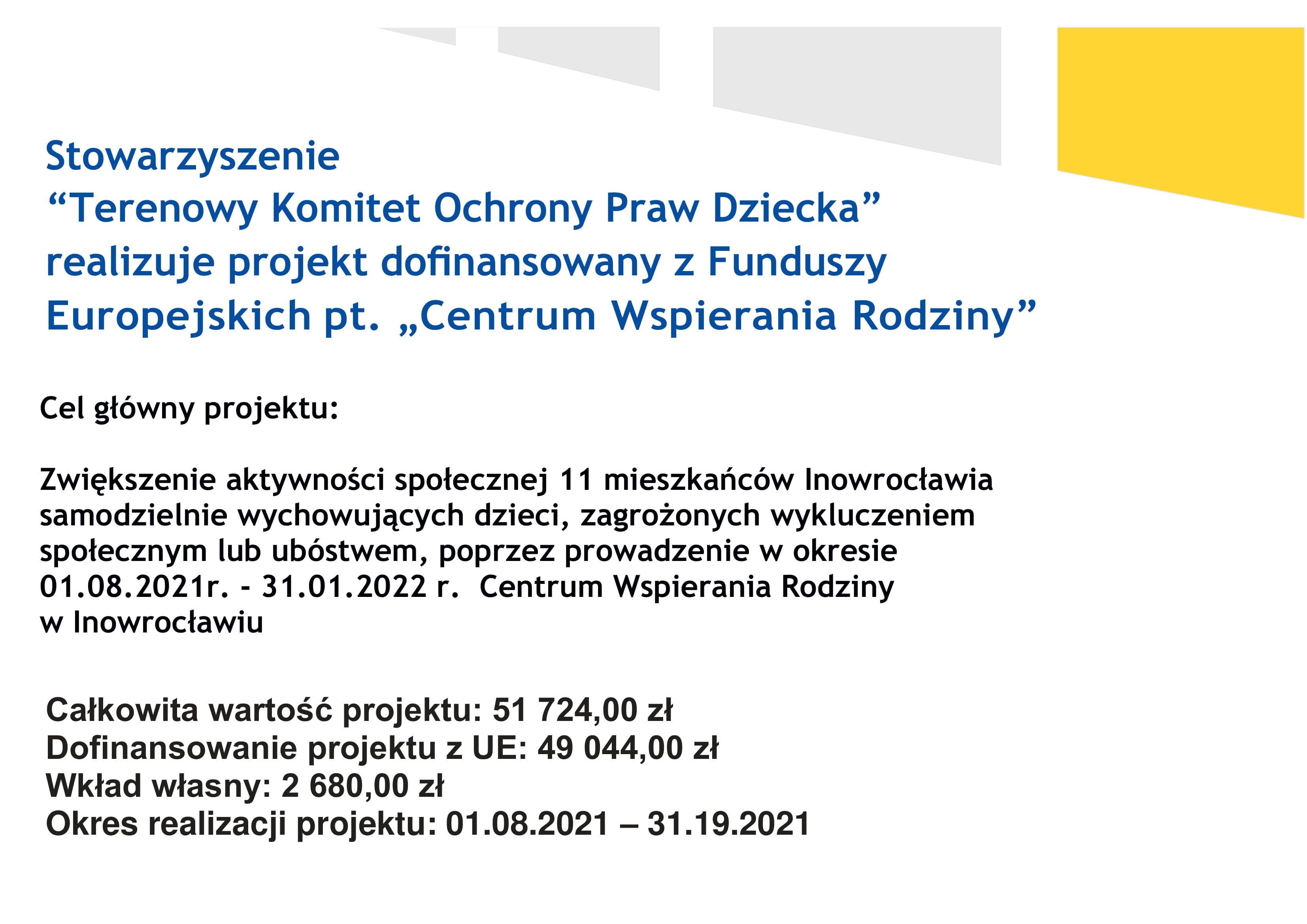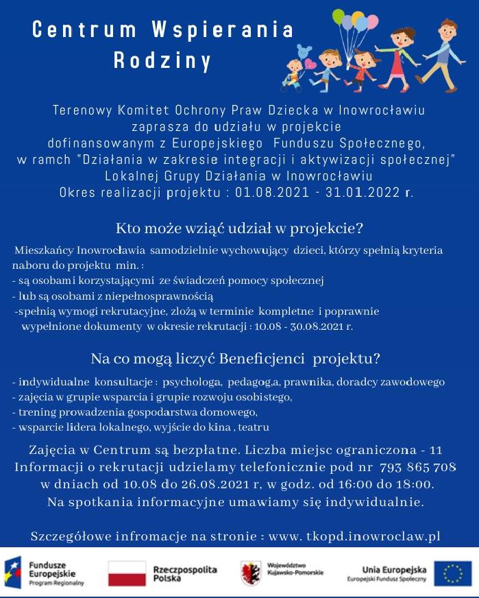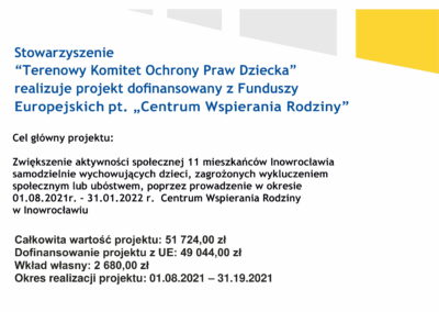 Od 1 sierpnia 2021 roku Terenowy Komitet Ochrony Praw Dziecka realizuje projekt: “Centrum Wspierania Rodziny”. Do projektu można zgłaszać się pod numerem telefonu 793-865-708 w godzinach 16:00-18:00.