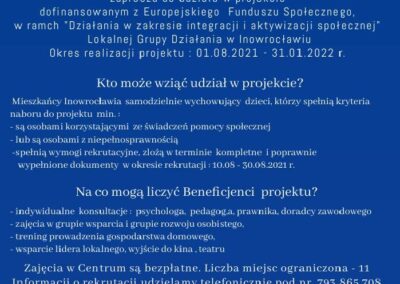 Celem projektu jest zwiększenie aktywności społecznej 11 mieszkańców Inowrocławia samodzielnie wychowujących dzieci, zagrożonych wykluczeniem społecznym lub ubóstwem, poprzez prowadzenie w okresie 01.08.2021 r.-31.01.2022 r. Centrum Wspierania Rodziny w Inowrocławiu
