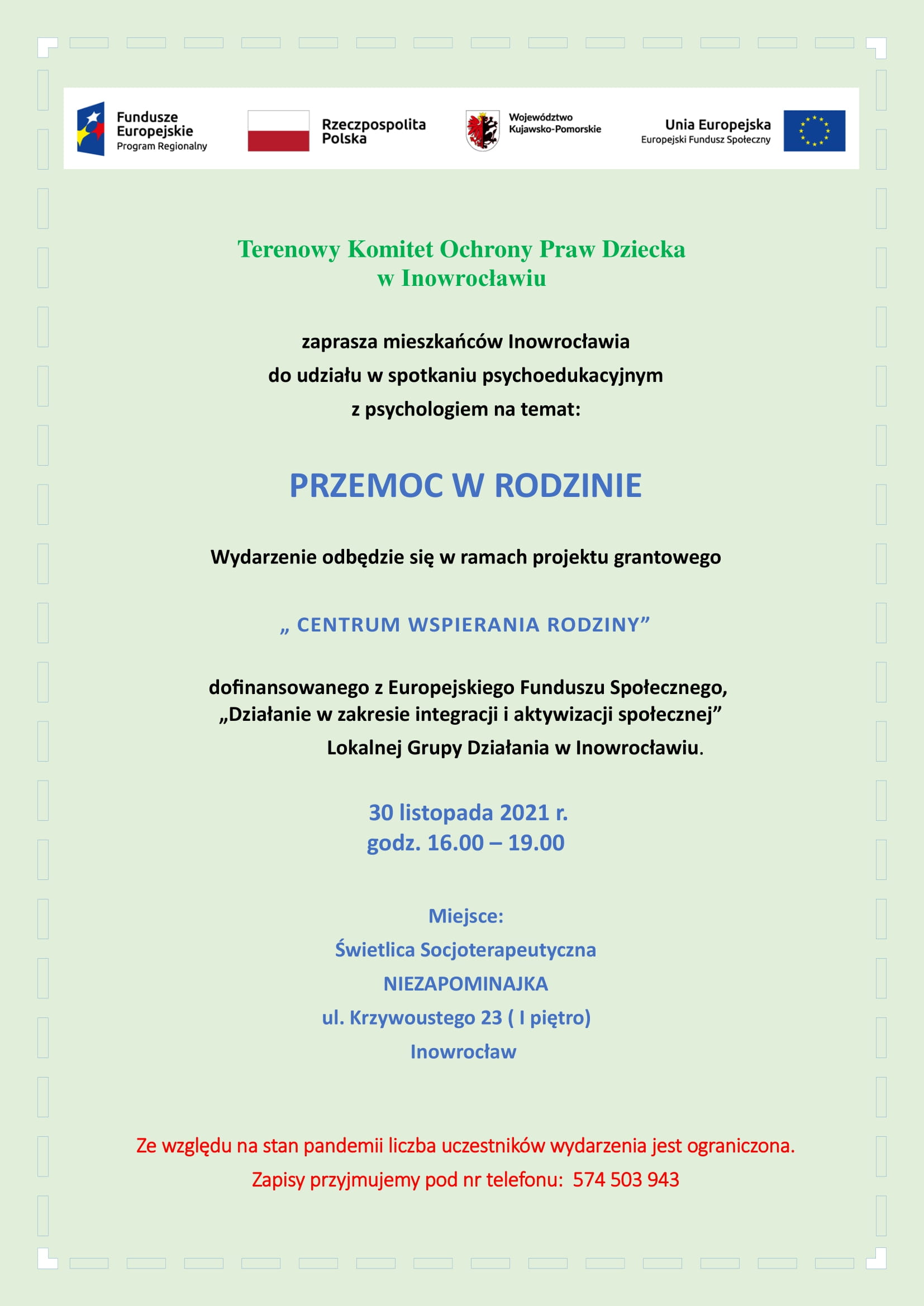 Terenowy Komitet Ochrony Praw Dziecka w Inowrocławiu zaprasza mieszkańców Inowrocławia do udziału w spotkaniu psychoedukacyjnym z psychologiem na temat: „Przemoc w rodzinie”, które odbędzie się 30 listopada 2021r. w Świetlicy Socjoterapeutycznej NIEZAPOMINAJKA. Zapisy pod nr tel.: 574-503-943. Spotkanie realizowane w ramach projektu „Centrum wspierania rodziny” dofinansowanego ze środków Europejskiego Funduszu Społecznego.