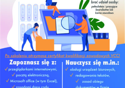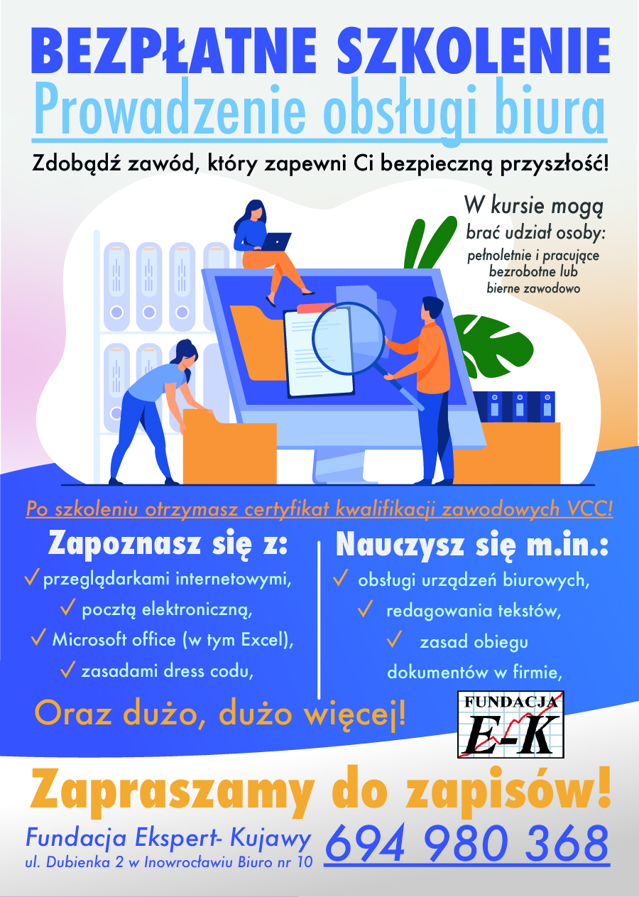 PROWADZENIE OBSŁUGI BIURA: do udziału w kursie może zgłosić się każda osoba pracującą, bezrobotna lub bierna zawodowo, która posiada min. średnie wykształcenie.